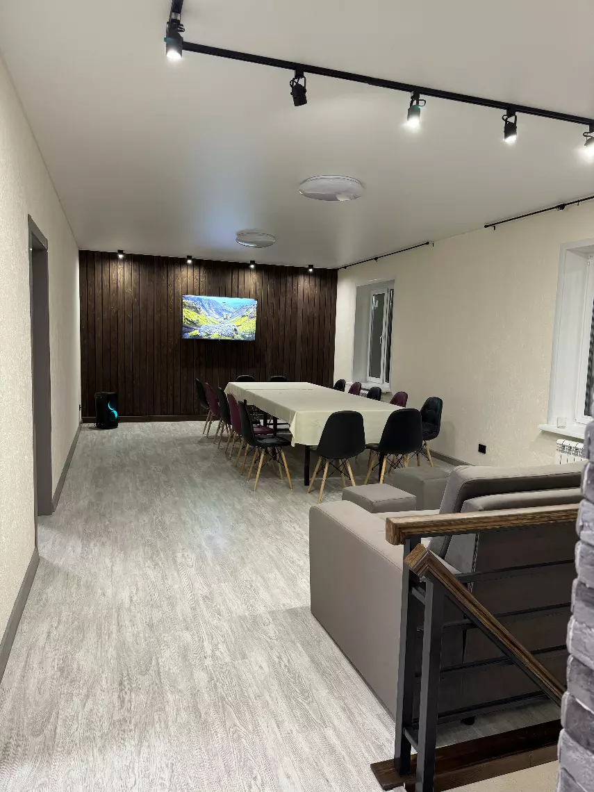 - Праздник для большой компании: банкетный зал на 15 человек, 2 спальни на 8 гостей и вся инфраструктура для веселья: музыкальная колонка, ТВ и настольный футбол.